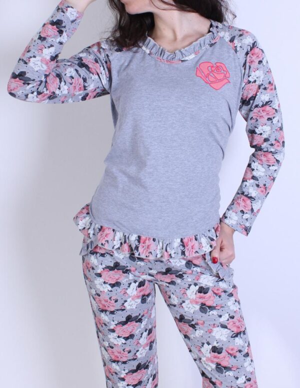Zelo mehka in udobna pižama. Pižama ima prelep potisk vrtnic. Sestava: 95% bombaž, 5% elastan.